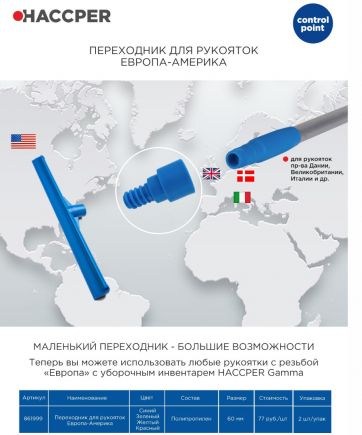 Переходник применяется для крепления рукояток с европейской резьбой к уборочному инвентарю с американской резьбой.