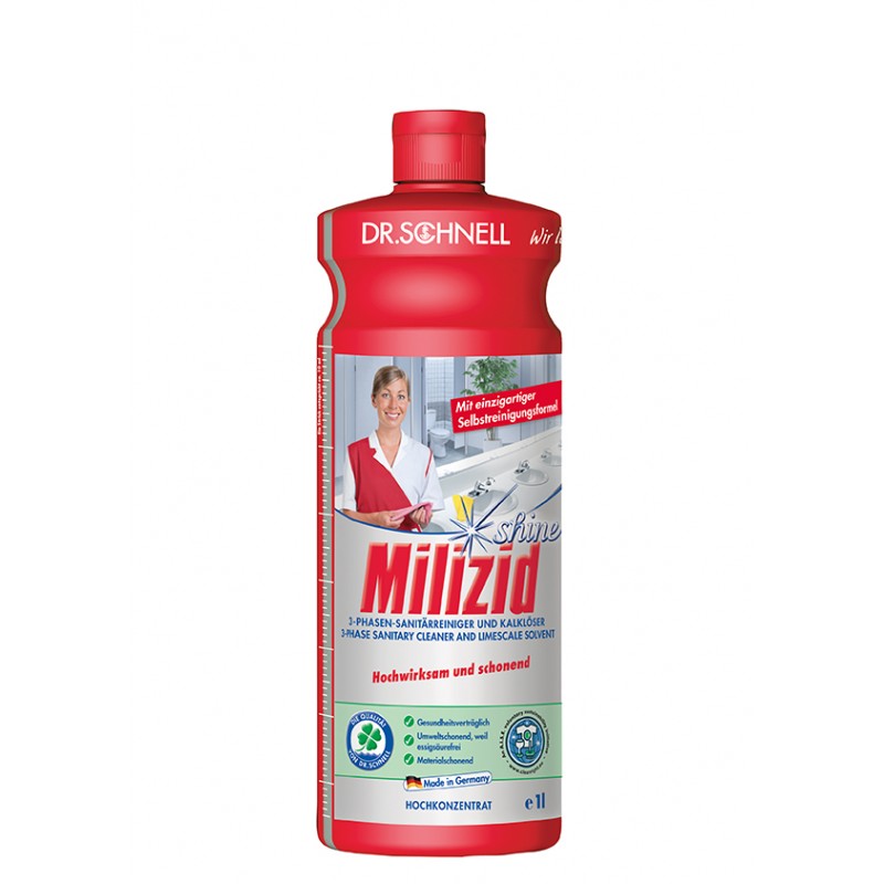 Milizid (Милицид) от DR.SCHNELL - средство для очистки санитарных зон и удаления отложений. Подходит для очистки любых поверхностей стойких к воздействию кислот. Применяется для очистки санитарных зон и влажных помещений. За секунды удаляет известковый налет, накипь, ржавчину, мочевой камень, жир, следы от косметики и мыльную пену. Подходит для всех методов очистки.
