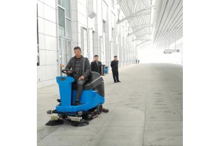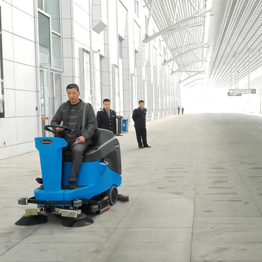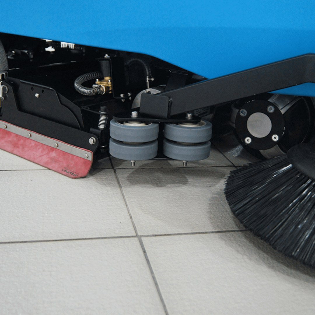 Машина уверенно работает на плитке, ПВХ и обработанном бетоне. Теоретическая производительность при подметании доходит до 6875 м²/ч; реальное время непрерывной работы обычно 3–5 часов — зависит от режима и дозировки воды.