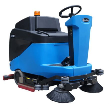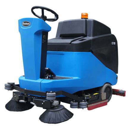 Gadlee GT180 75RS — подметально-поломоечная машина с местом оператора для больших площадей: ширина мытья 750 мм, подметания 1050 мм, скребок 1050 мм, баки 135/180 л. Мытьё и подметание за один проход, One-Touch и OBD; работа 3–5 ч, скорость до 6,5 км/ч.