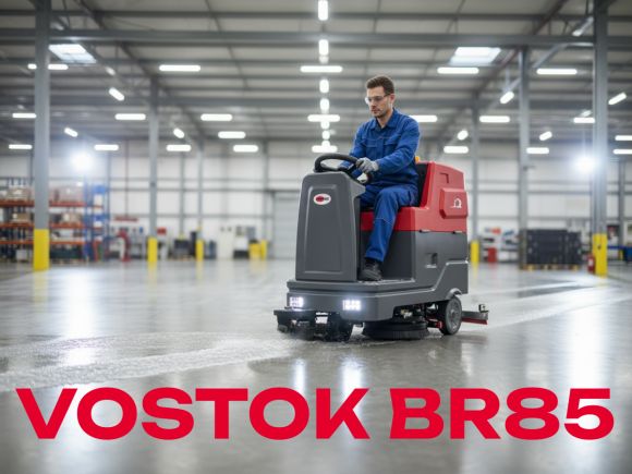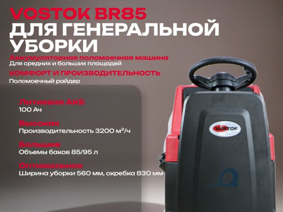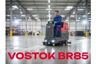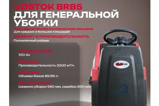 VOSTOK BR85 – Компактная машина с метом для оператора, рекомендуется для генеральной и поддерживающей уборки в помещениях от 1 000 до 6 000 м2, в том числе неправильной формы и заставленных. Машина поставляется полностью готовой к работе, в комплектации с водосборной балкой, полипропиленовой щеткой, а также комплектом Литиевой аккумуляторной батарей, с зарядным устройством.