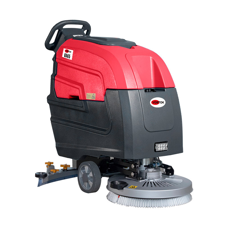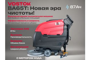 VOSTOK BA65T - простая, надежная и доступная по цене поломоечная машина с приводом на колеса. Станет надежным помощником для уборки различных помещений, такие как: супермаркеты, больницы и общественные помещения. Высокая производительность BA65 достигается за счет мощных АКБ и баков для чистой и грязной воды 62 л и 67 л соответственно.