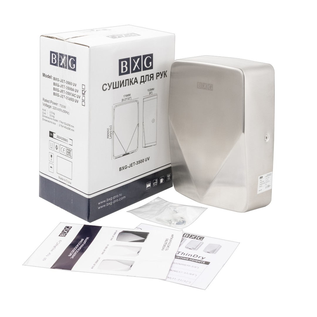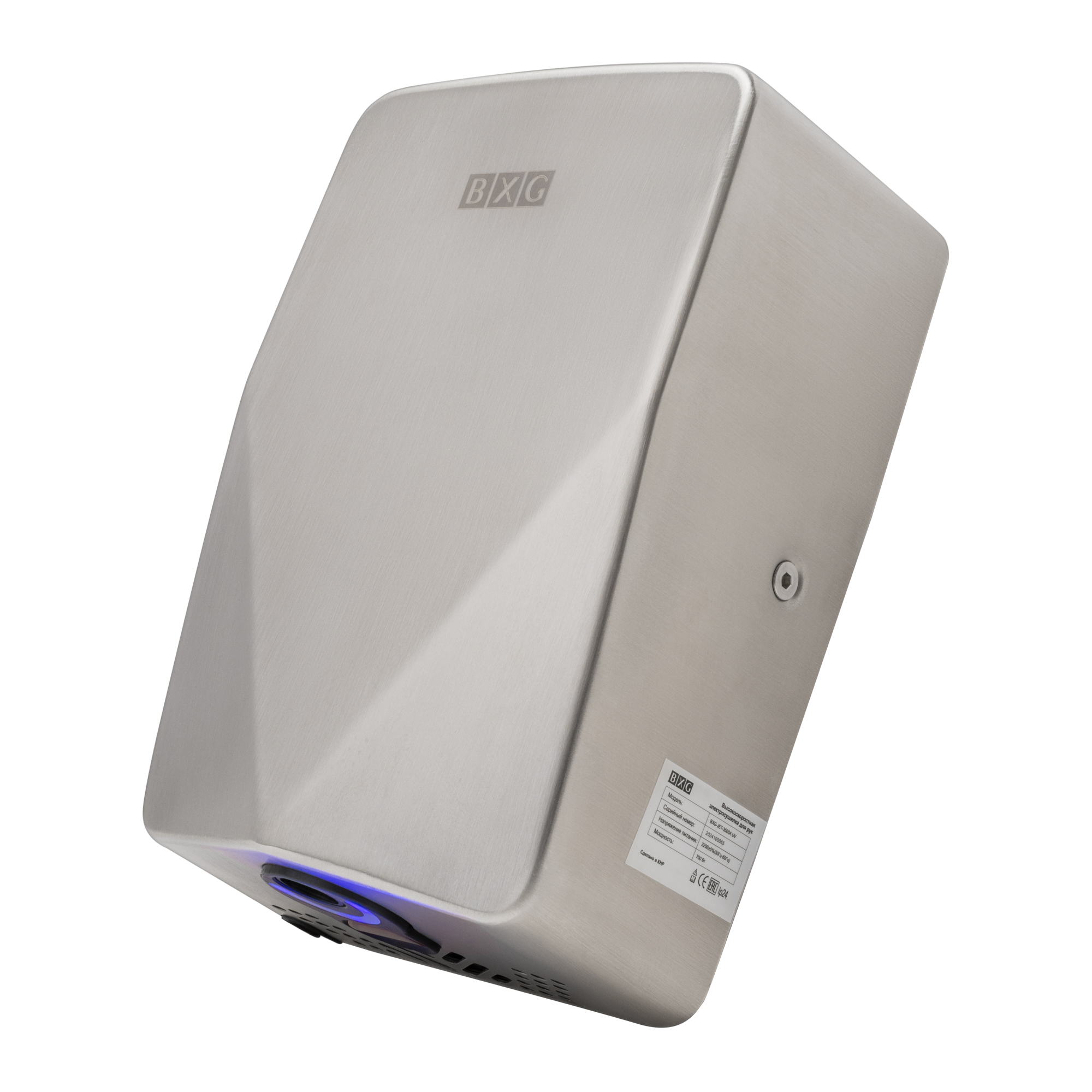 BXG-JET-3500А UV – Высокоскоростная сушилка для рук нового поколения с функцией Ультрафиолетового обеззараживания. Корпус сушилки выполнен из нержавеющей стали в матовом покрытии.