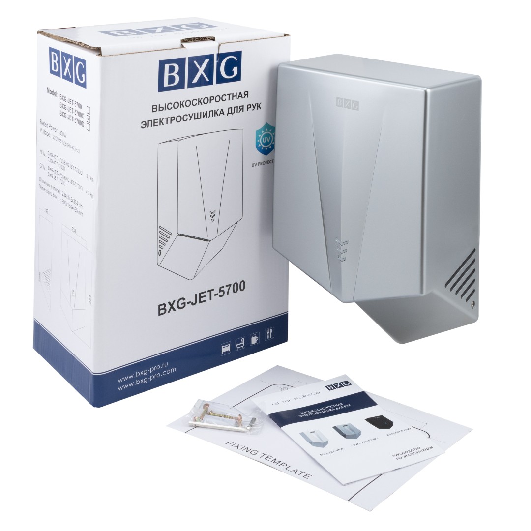 BXG-JET-5700С обладает самым высоким классом пыле/влагозащиты IP24- (исключено попадание влаги и крупнодисперсной пыли вовнутрь устройства со всех сторон) и возможность короткого замыкания или удара электрическим током при правильной эксплуатации исключена. Благодаря ИК-датчикам и технологии микропроцессорного управления осуществляется независимый контроль, который предотвращает слишком долгое использование сушилки или использование не по назначению. Прибор оснащён устройством автоматического отключения на случай перегрева, короткого замыкания или скачков напряжения в электросети.