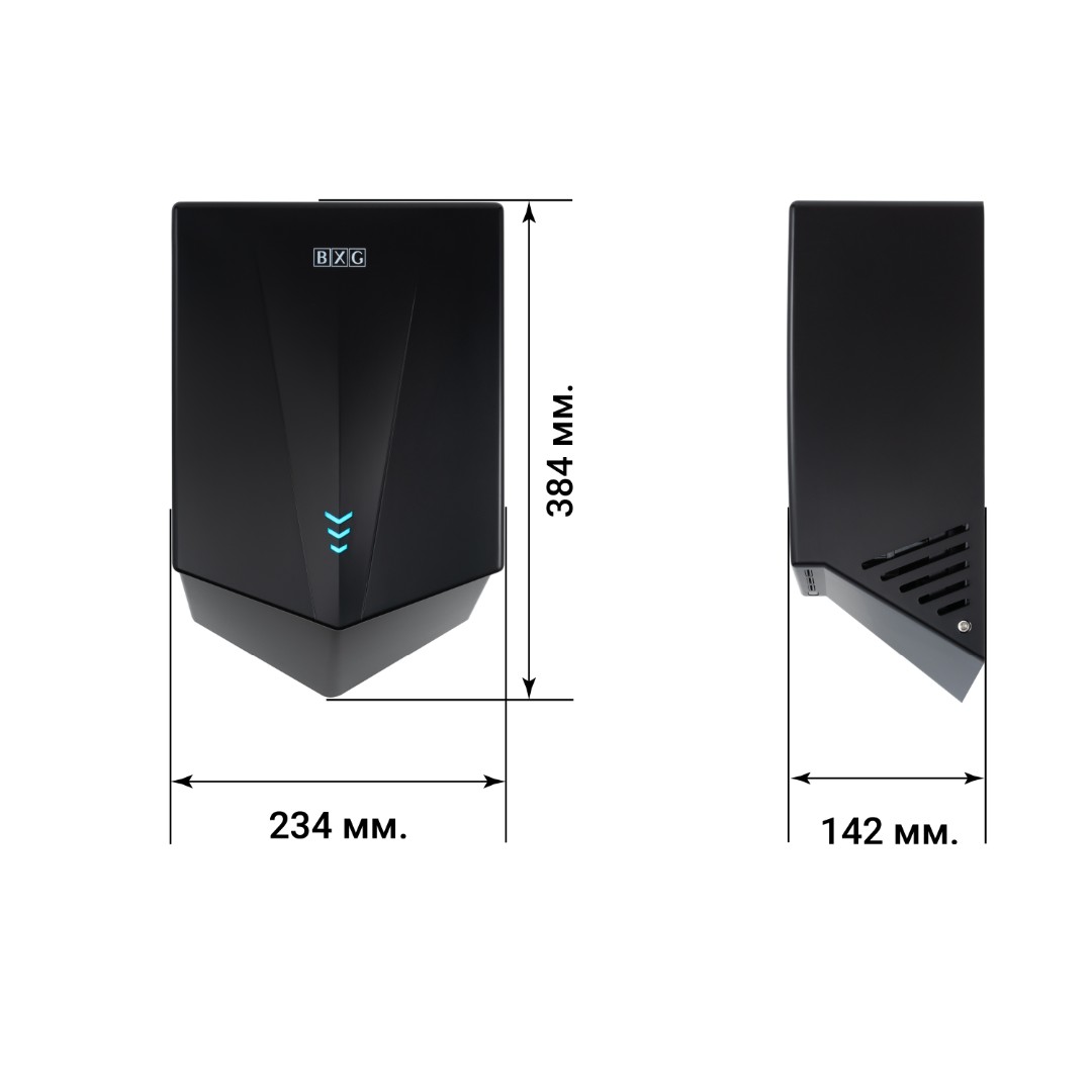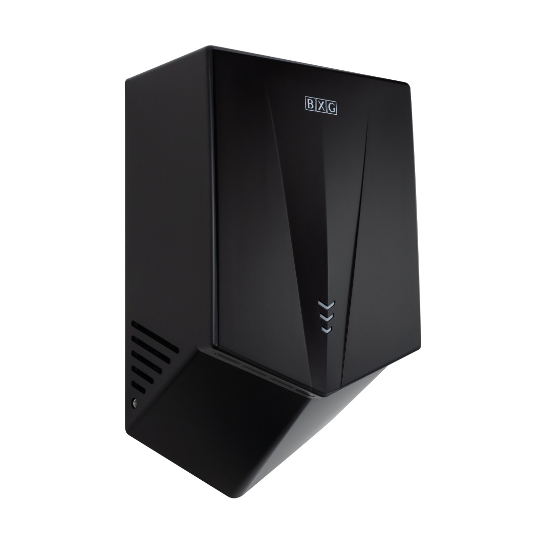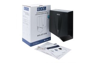 BXG-JET-5700D – Высокоскоростная электросушилка сушилка для рук нового поколения с функцией Ультрафиолетового обеззараживания. Сушилка выполнена из высокопрочного пластика ABS в благородном черном цвете с матовым оттенком.