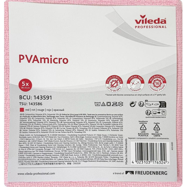 Салфетка ПВАмикро от Vileda Professional из микроволокна с уникальным ПВА покрытием предназначена для профессиональной уборки любых поверхностей. Запатентованное ПВА покрытие обеспечивает быстрое впитывание влаги, а микроволокно глубоко проникает в структуру поверхности, очищая её за одно движение.