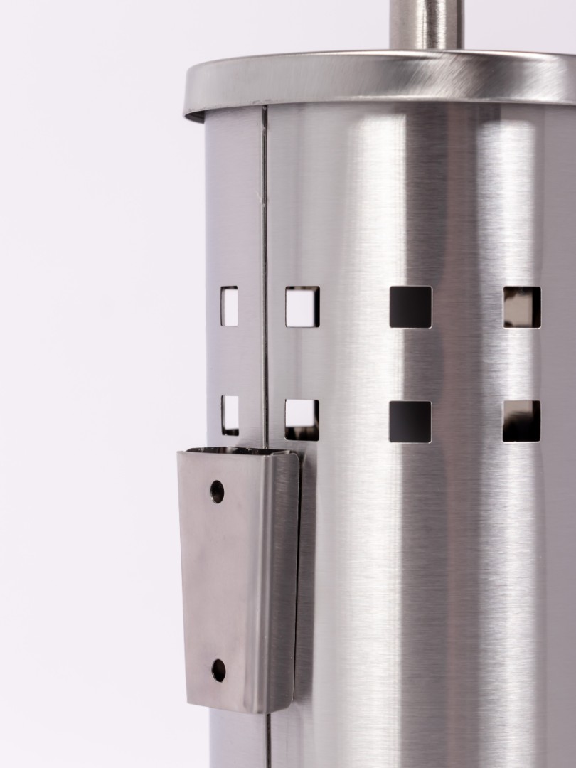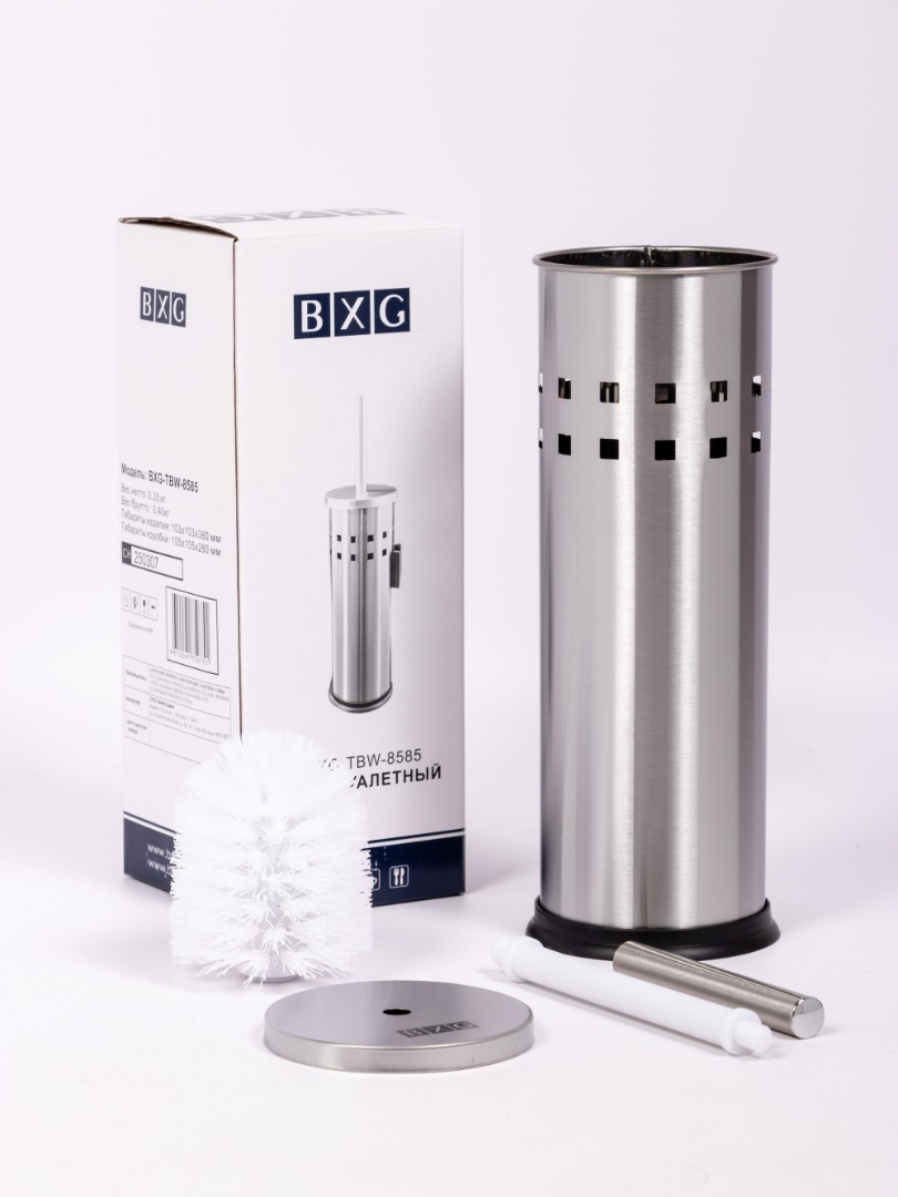 BXG-TBW-8585– предназначен для туалетных комнат. Выполнен из нержавеющей стали 410SS с матовым покрытием Щетина из качественного полиуретана. Конструкция разборная. Крепится к стене или ставится на пол. На корпусе имеется вырубка в виде мелких квадратиков, для проветривания щетки и стаканчика. Подходит для любых туалетных и ванных комнат любых помещений!