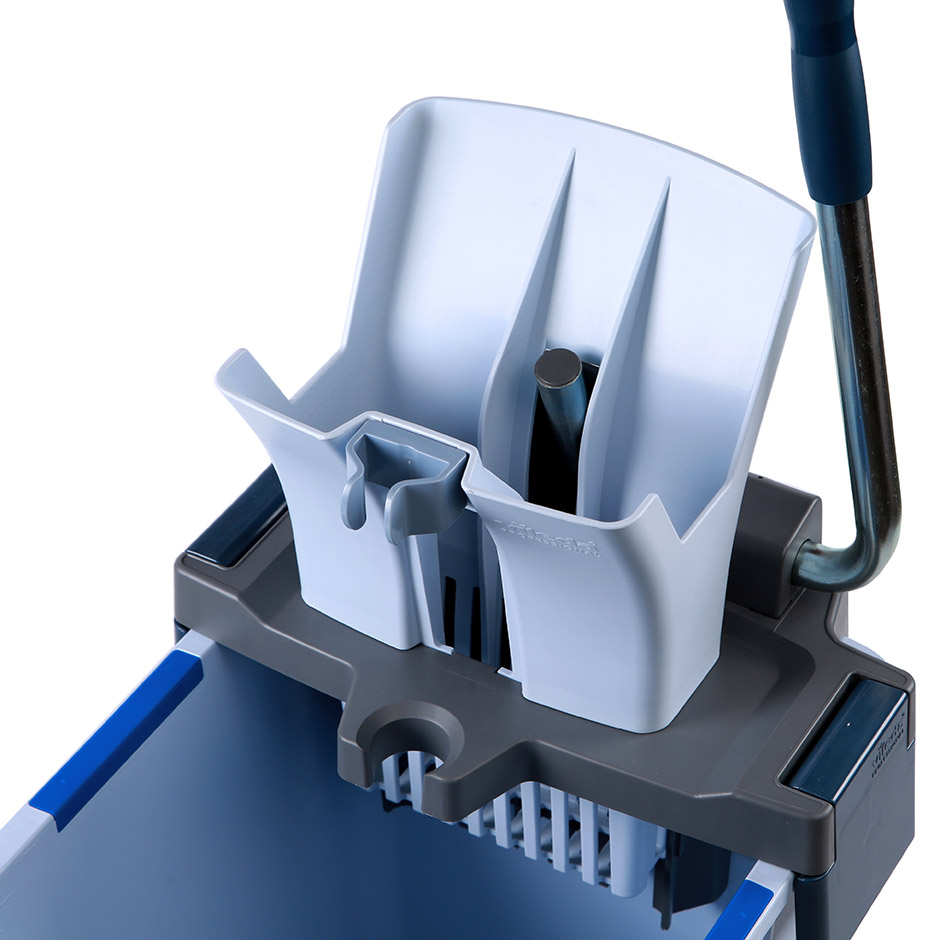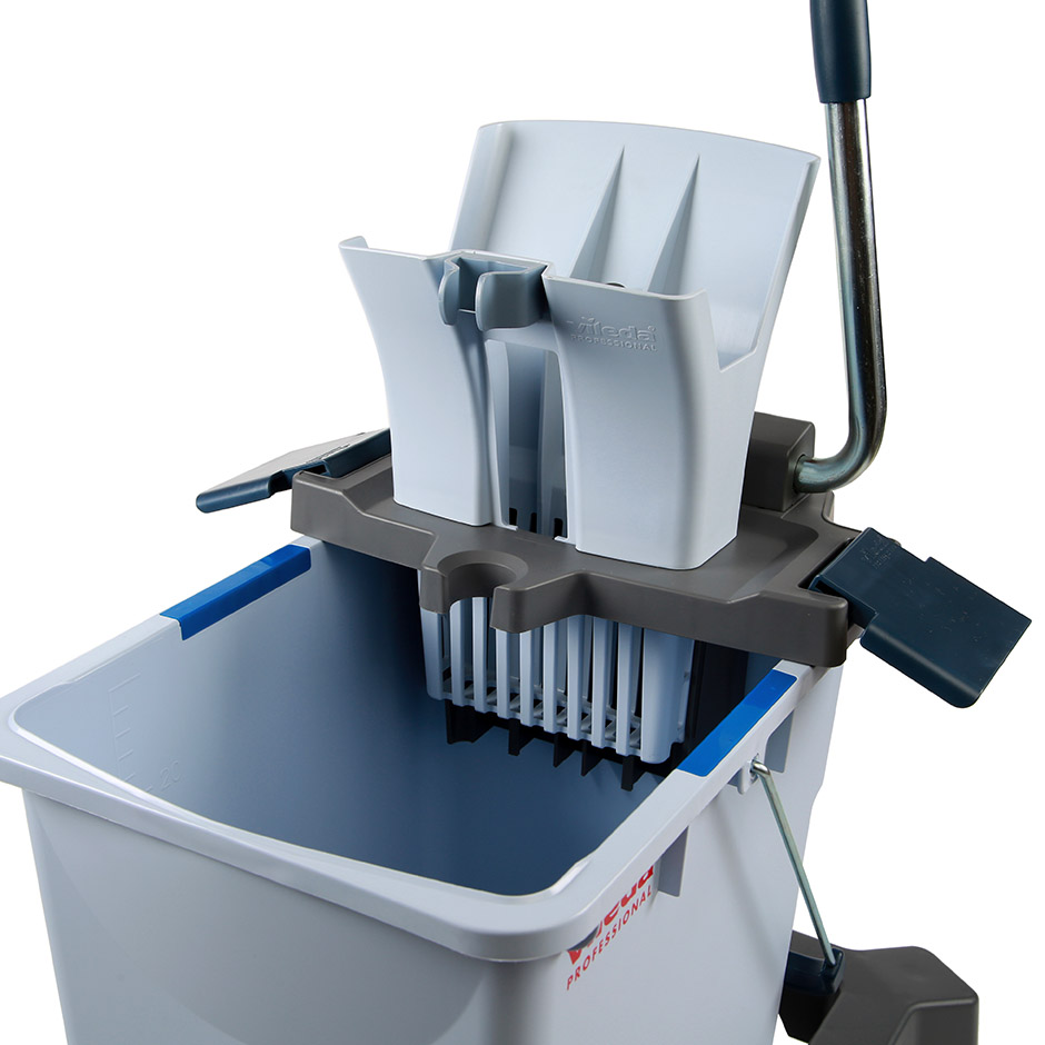 Система УльтраСпид Про с ведром 25 л на платформе и без транспортировочной ручки представляет собой профессиональную систему для уборки, которая обладает уникальным высокоэффективным отжимом насадок. Основные характеристики и преимущества данной системы включают:
